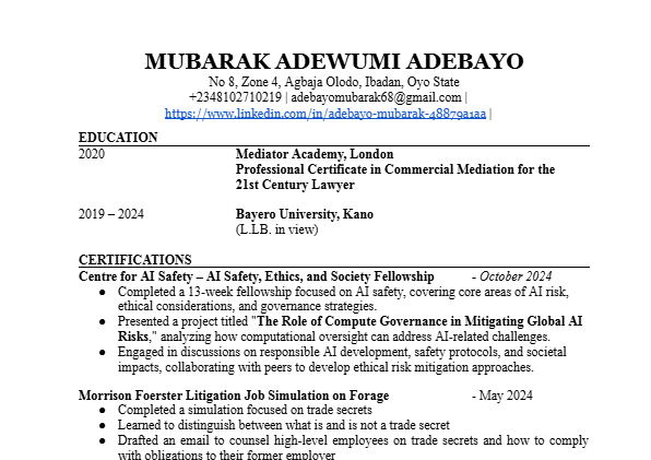 MUBARAK ADEWUMI ADEBAYO No 8, Zone 4, Agbaja Olodo, Ibadan, Oyo State +2348102710219 | adebayomubarak68@gmail.com | https://www.linkedin.com/in/adebayo-mubarak-48879a1aa | EDUCATION 2020 Mediator Academy, London Professional Certificate in Commercial Mediation for the 21st Century Lawyer...